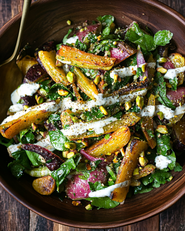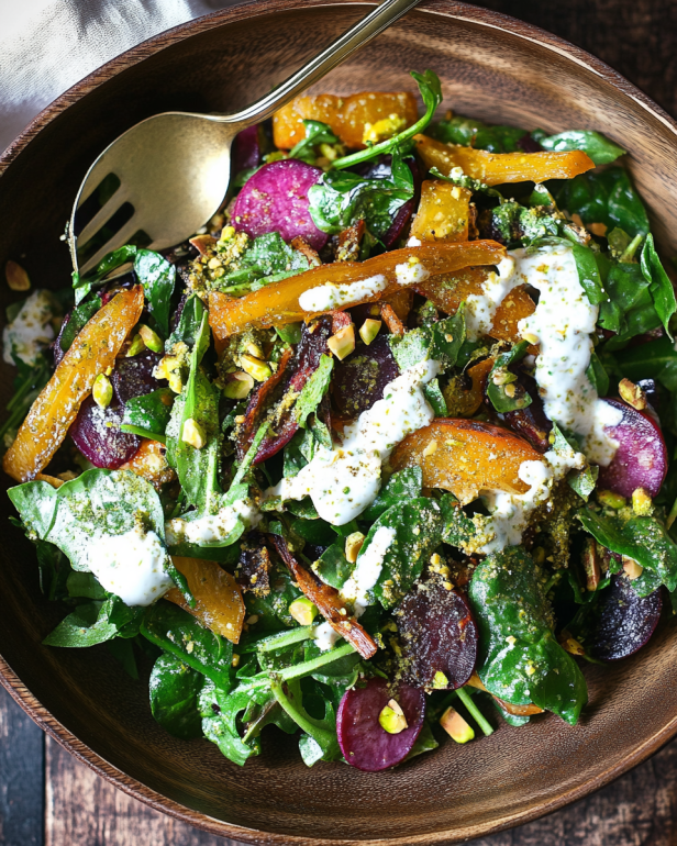 Whether you’re enjoying it as a light lunch, a side dish at dinner, or a centerpiece for a gathering, this salad is versatile and easy to prepare. The combination of root vegetables, fresh greens, and a creamy pistachio dressing creates a harmonious balance of flavors that everyone will love. Plus, with the option to customize ingredients based on the season or your personal preferences, you can make this salad your own.