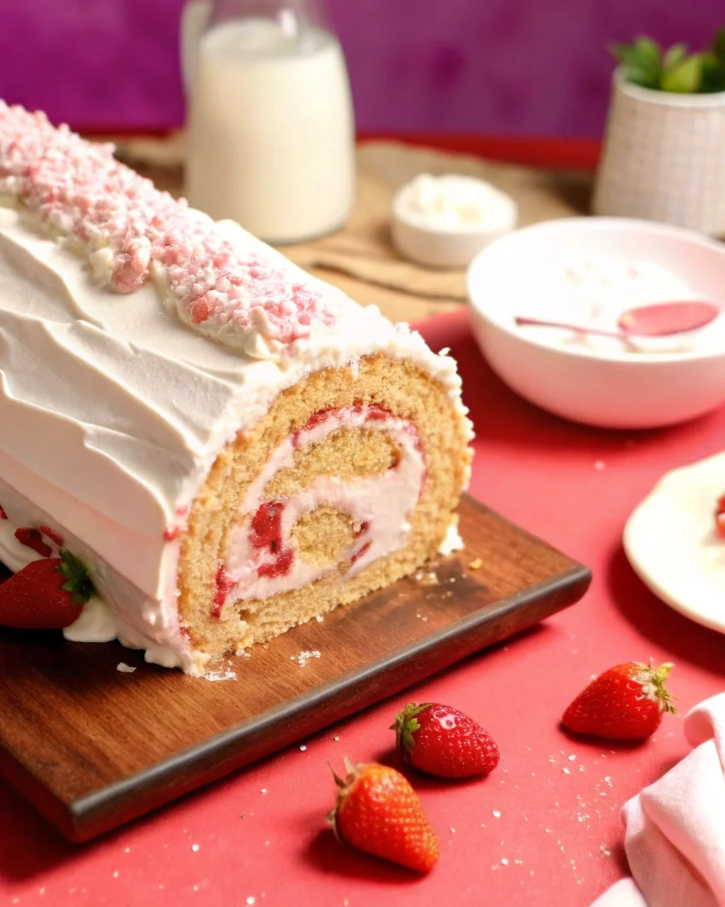 • Assemble the Dessert Roll: Unroll the cooled cake, remove the towel, and spread cheesecake filling evenly. Add sliced strawberries on top. Carefully roll the cake back up and refrigerate for 1 hour to set.