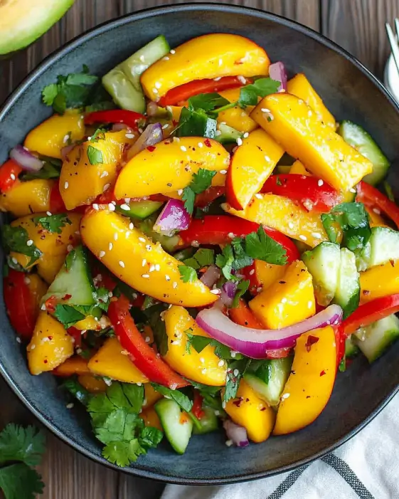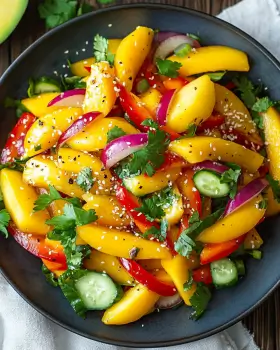 A refreshing and vibrant salad combining sweet mangoes with spicy and tangy flavors, perfect for a light meal or side dish.