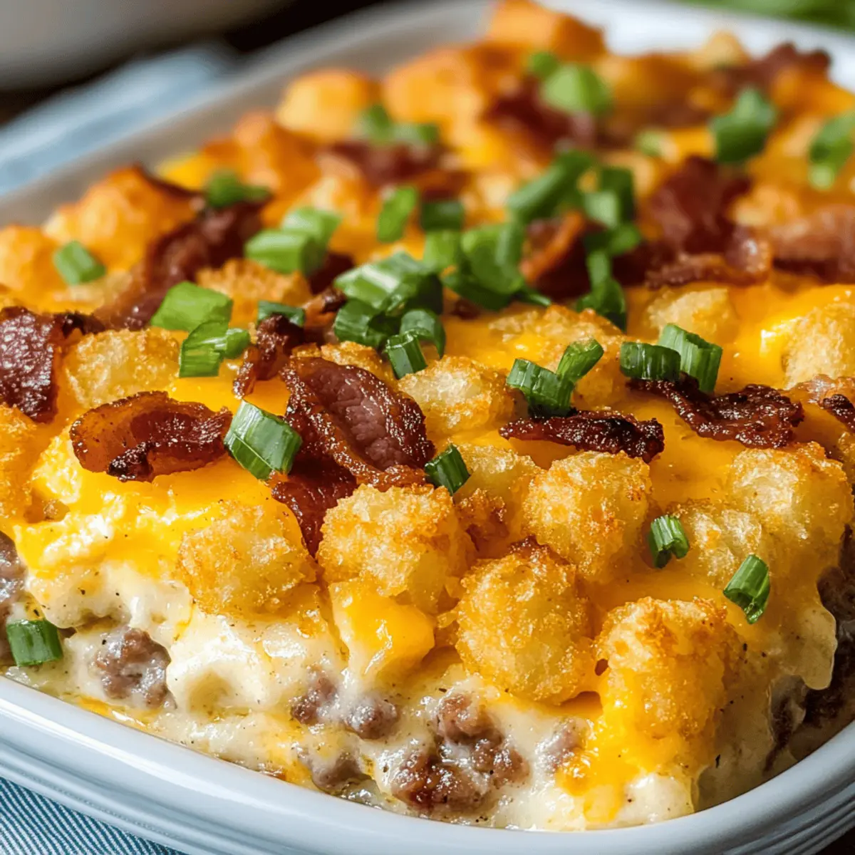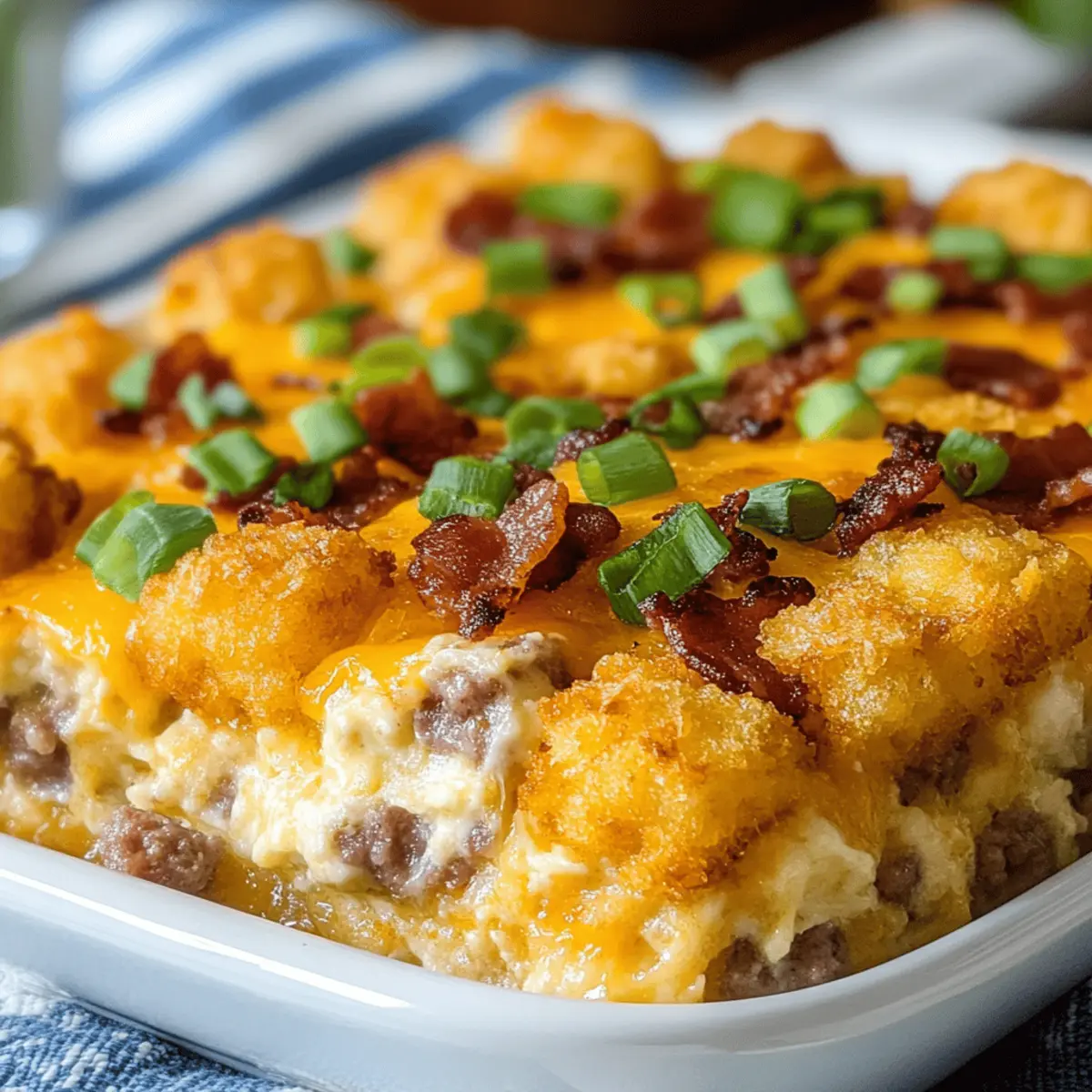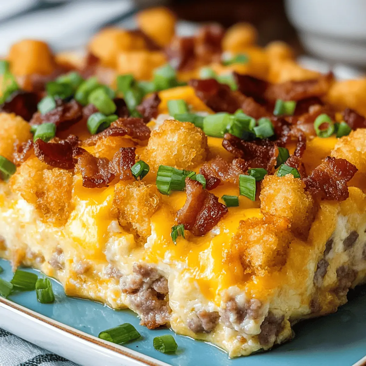 A delightful Tater Tot Breakfast casserole featuring crispy tater tots, smoky bacon, savory sausage, and creamy cheese, perfect for weekend mornings.