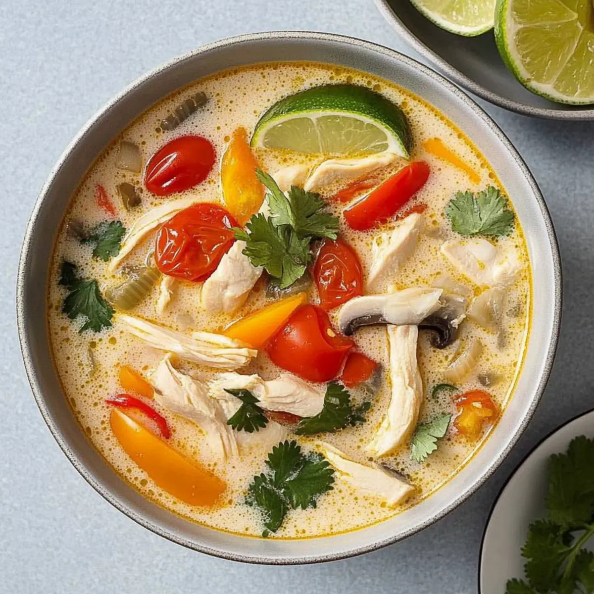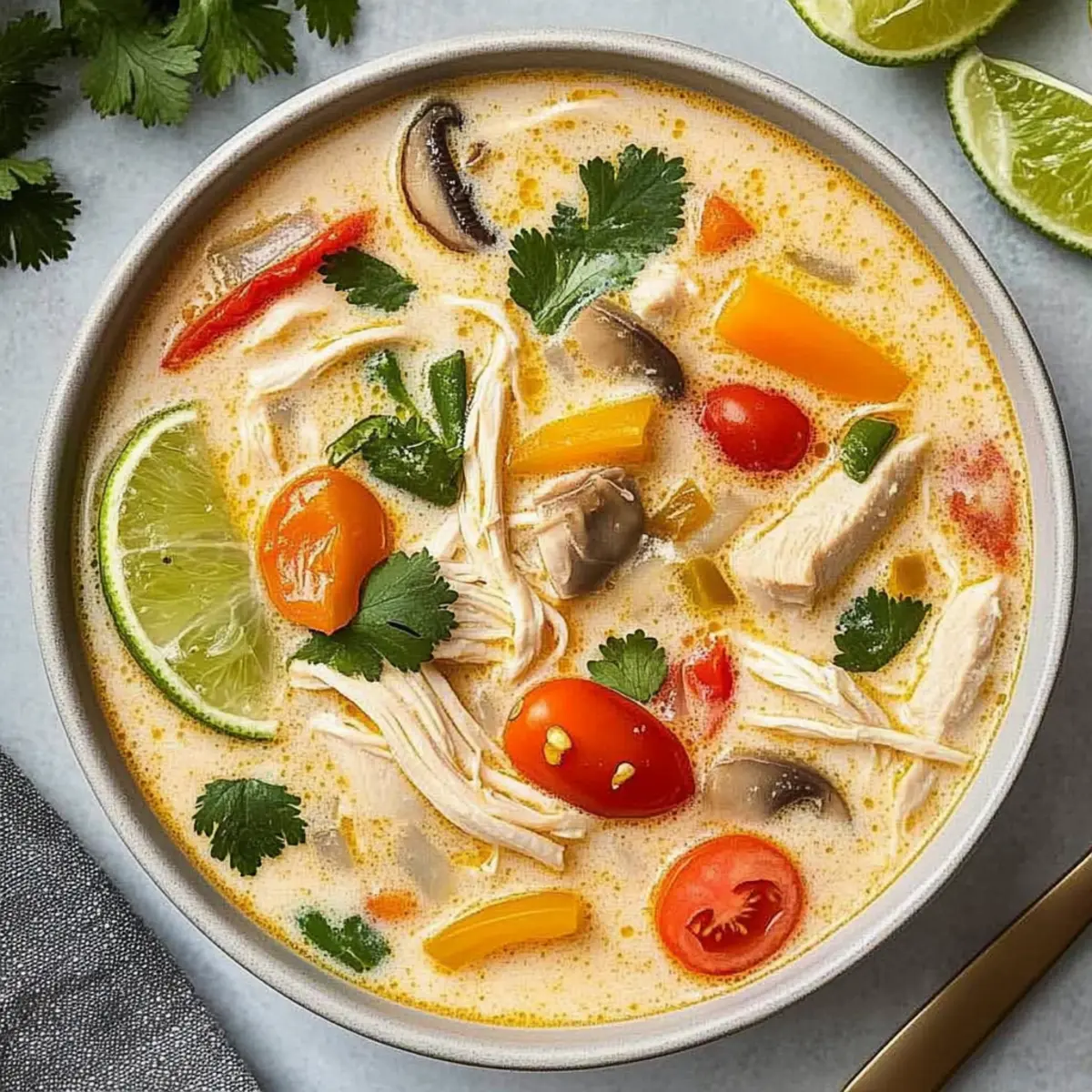 Experience the warmth of Tom Kha Gai, a deliciously creamy coconut chicken soup that's a comforting Thai classic.