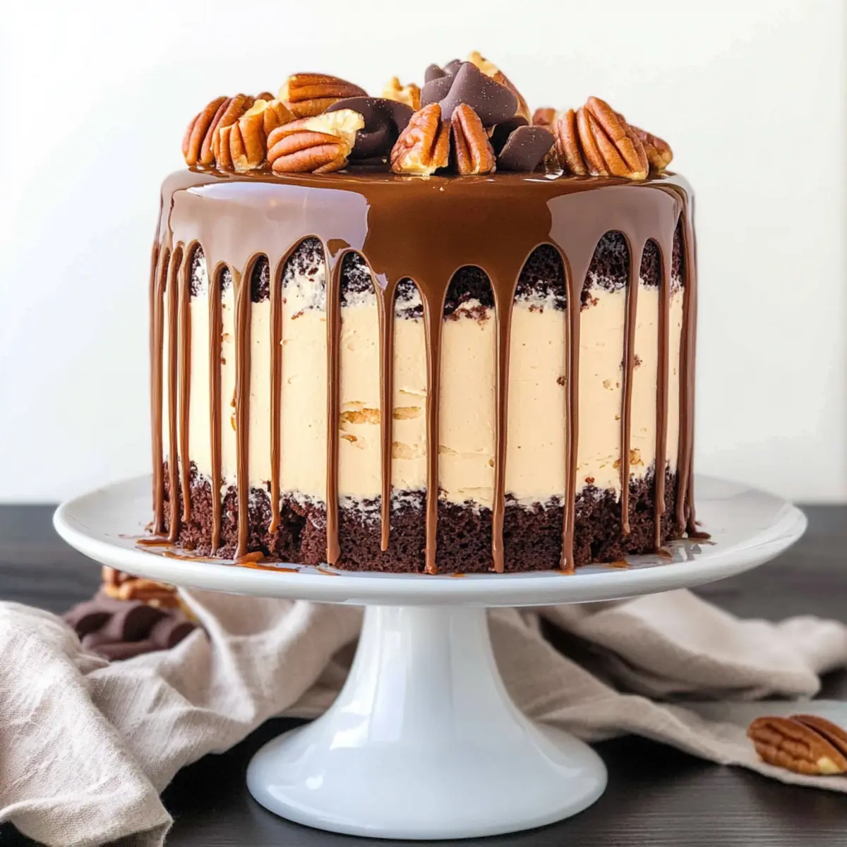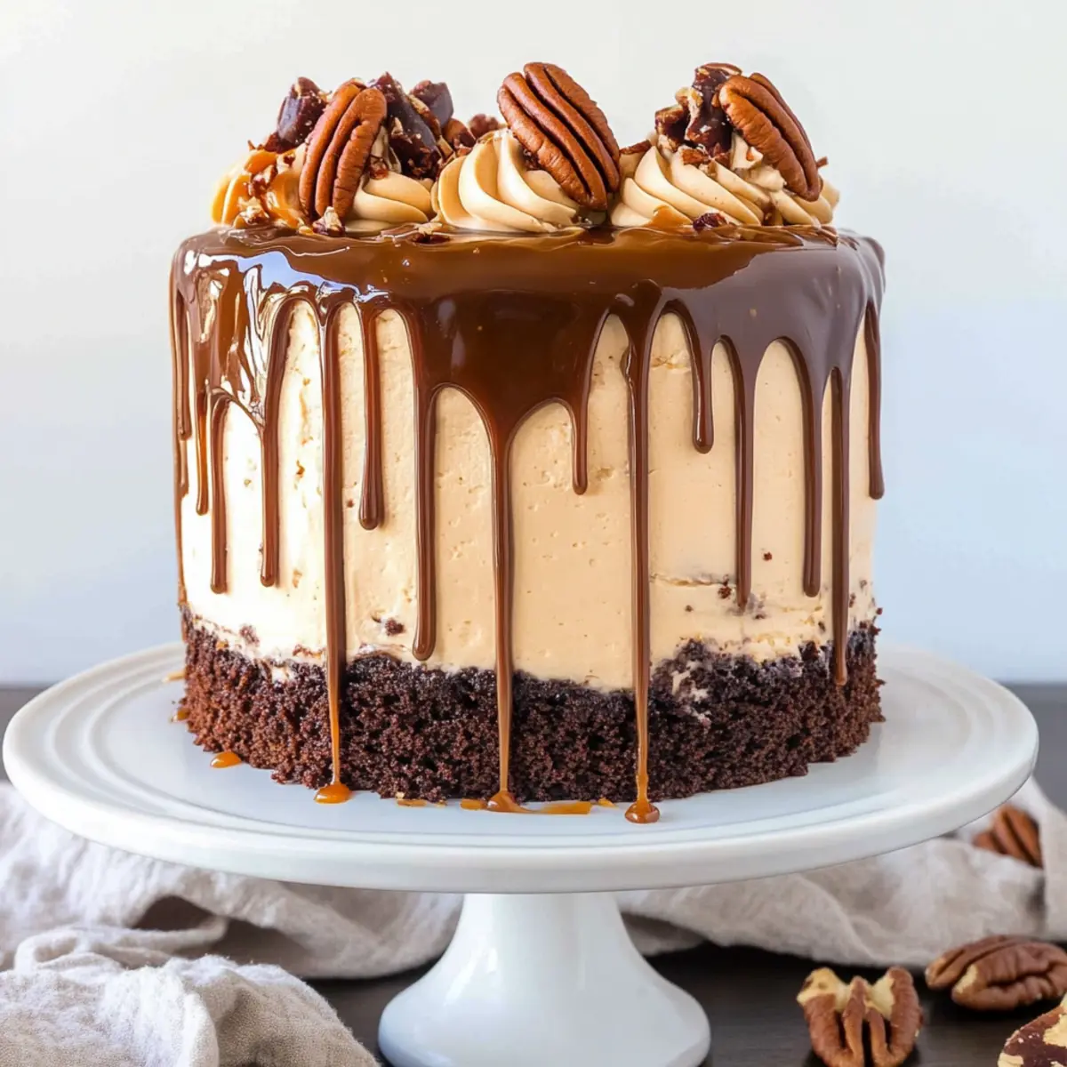 These Turtles Layer Cake components are perfect for meal prep, allowing you to save significant time on baking day! You can prepare the cake layers up to 24 hours in advance; simply bake them, cool completely, and then wrap each layer tightly in plastic wrap before refrigerating. The ganache and caramel sauces can also be made up to 3 days ahead; store them in airtight containers in the fridge to maintain their creamy texture. When you’re ready to assemble, just bring everything to room temperature, layer the cake with the buttercream, ganache, and caramel, and enjoy this indulgent treat with minimal effort. With these make-ahead options, your Turtles Layer Cake will be just as delicious and a perfect centerpiece for any occasion!