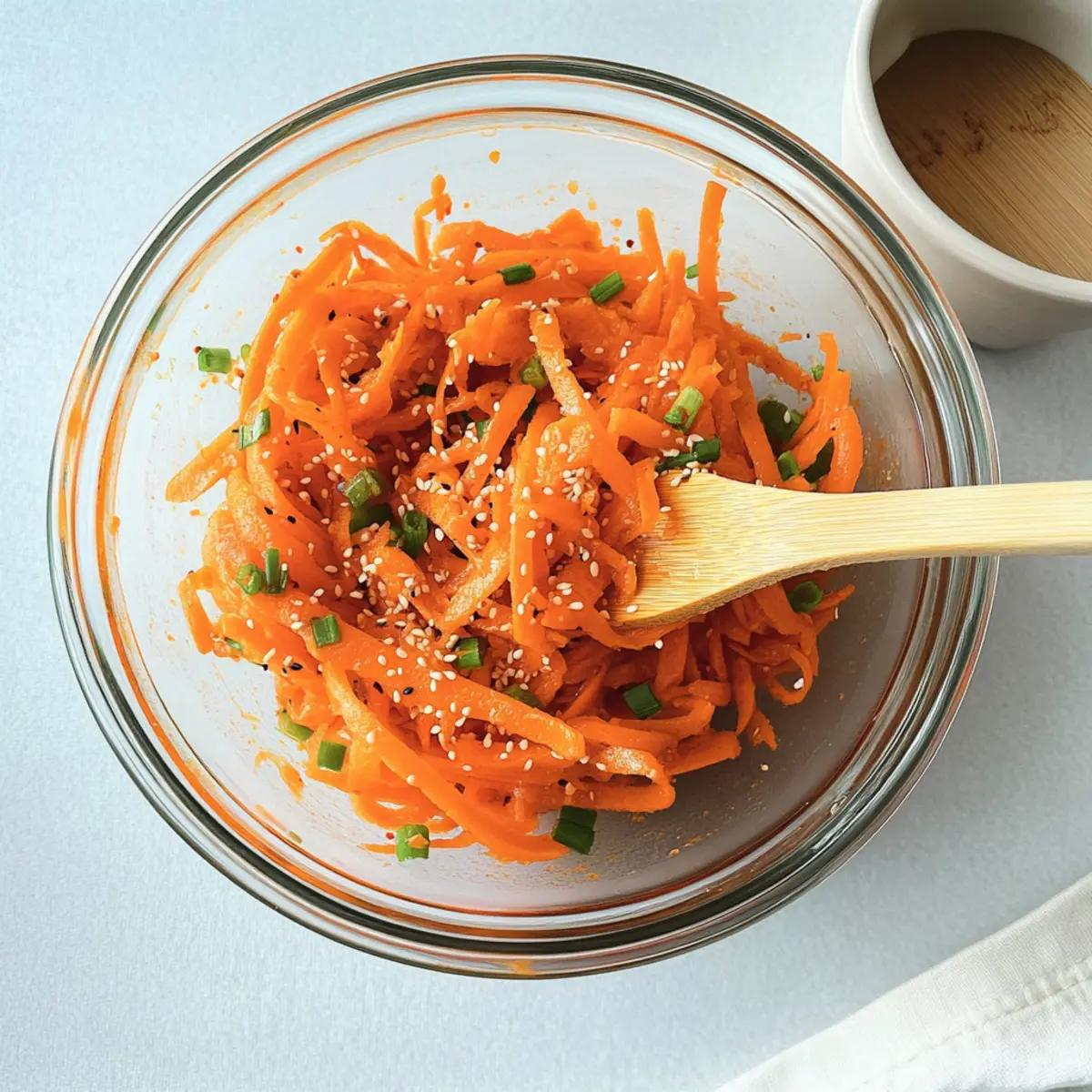 - In the bowl with the carrot ribbons, add the sliced green onions and minced garlic. Drizzle in the rice vinegar, soy sauce, chili crisp oil, and sesame oil. Finally, sprinkle in the cooled toasted sesame seeds.