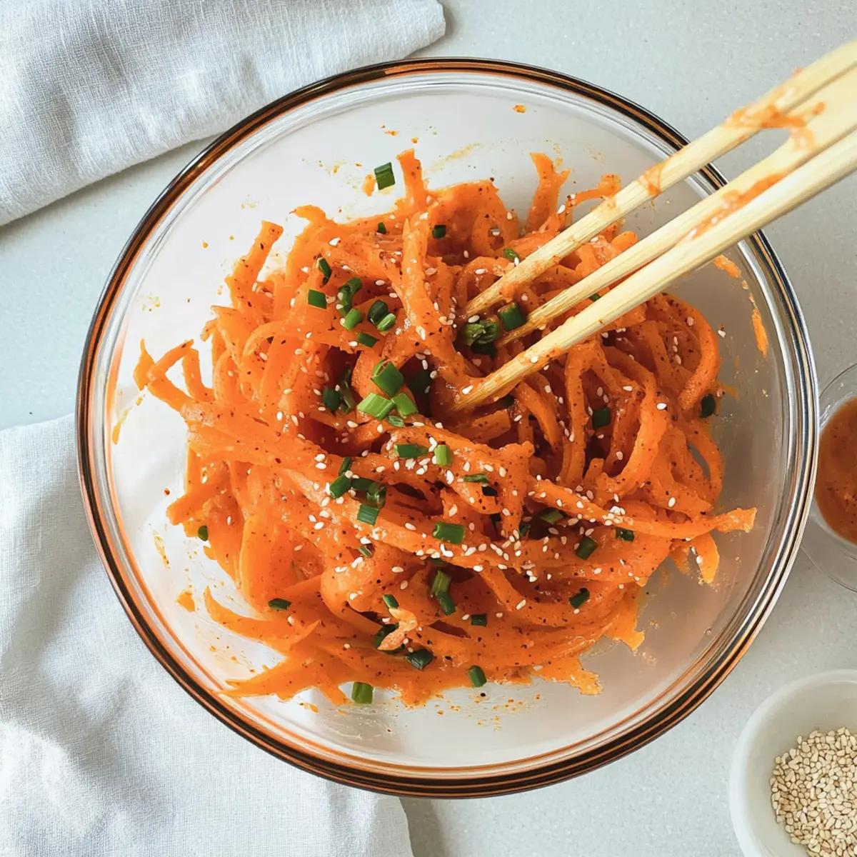 In a small bowl, whisk together rice vinegar, soy sauce, chili crisp oil, and sesame oil. Aim for a smooth and well-combined mixture; the vinegar adds tang, the soy sauce supplies umami depth, and the chili oil gives a spicy kick. Drizzle this dressing over the carrot mixture to add a burst of flavor to the salad.