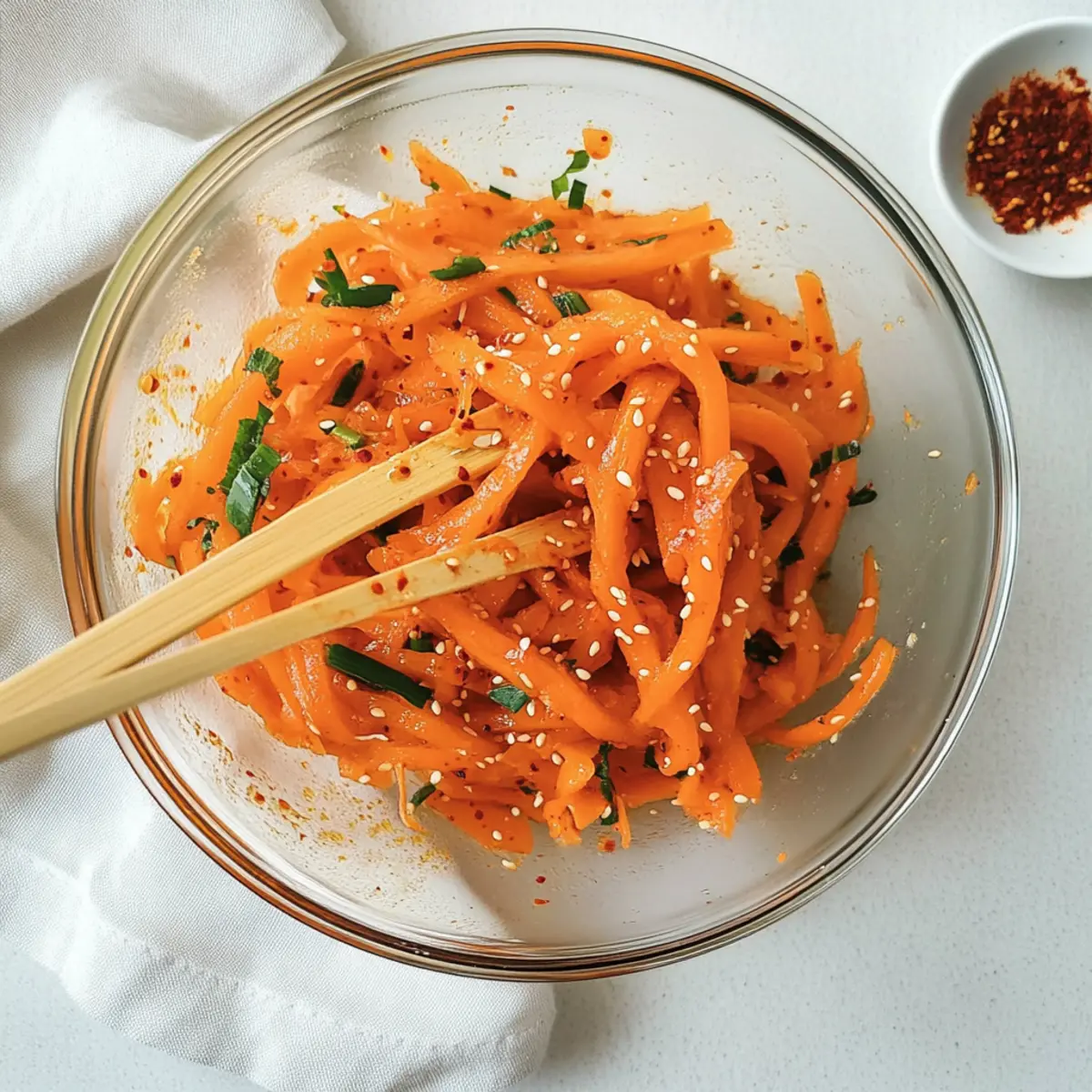 Using tongs, carefully toss the combined ingredients until everything is perfectly mixed and well incorporated. This ensures each bite of the Viral Carrot Ribbon Salad is bursting with flavor. If desired, serve the salad immediately for a fresh crunch, or place it in the refrigerator to chill for about 1-2 hours, allowing the flavors to meld beautifully.